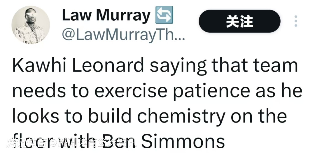 莱昂纳德表示,球队需要保持耐心,因为他正在努力与本-西蒙斯培养场上的默契。尽管在32分钟的比赛中出现了一些不协调的瞬间,但莱昂纳德称自己会为下一场比赛做好准备。