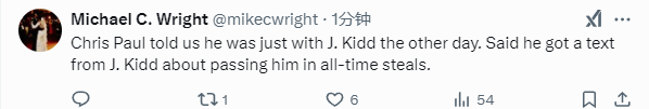 保罗表示,自己前几天才跟基德见过面,而今日在自己完成对基德的超越之后,基德也给自己发来了祝贺短信。此役,保罗送出2次抢断,生涯总抢断数达到2686次超越基德,独占NBA历史第2位。目前NBA历史抢断王是斯托克顿,他职业生涯总计完成过3265次抢断。