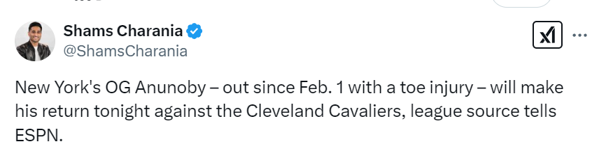 2025-02-22 07:30北京时间2月22日,据名记Shams报道,联盟消息人士向ESPN透露,纽约尼克斯队的OG-阿奴诺比将在今天对阵克利夫兰骑士队的比赛中复出。阿奴诺比在2月2日对湖人的比赛中脚趾受伤,此前已经连续缺席6场比赛,这6场比赛,尼克斯5胜1负。