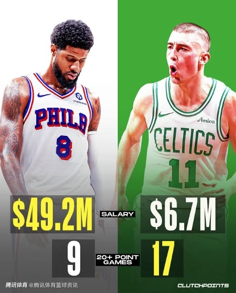 2025-02-22 09:00北京时间2月22日,篮球媒体ClutchPoints更新官方ins账号,晒出了一张76人球员保罗-乔治与凯尔特人队替补普里查德的对比图。根据图中的数据显示,本赛季年薪4920万美元的乔治总计只有9场比赛得分20+,而年薪仅有670万美元的普里查德则在17场比赛中砍下20+。