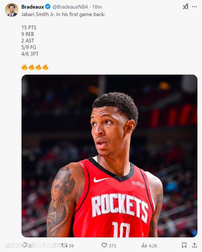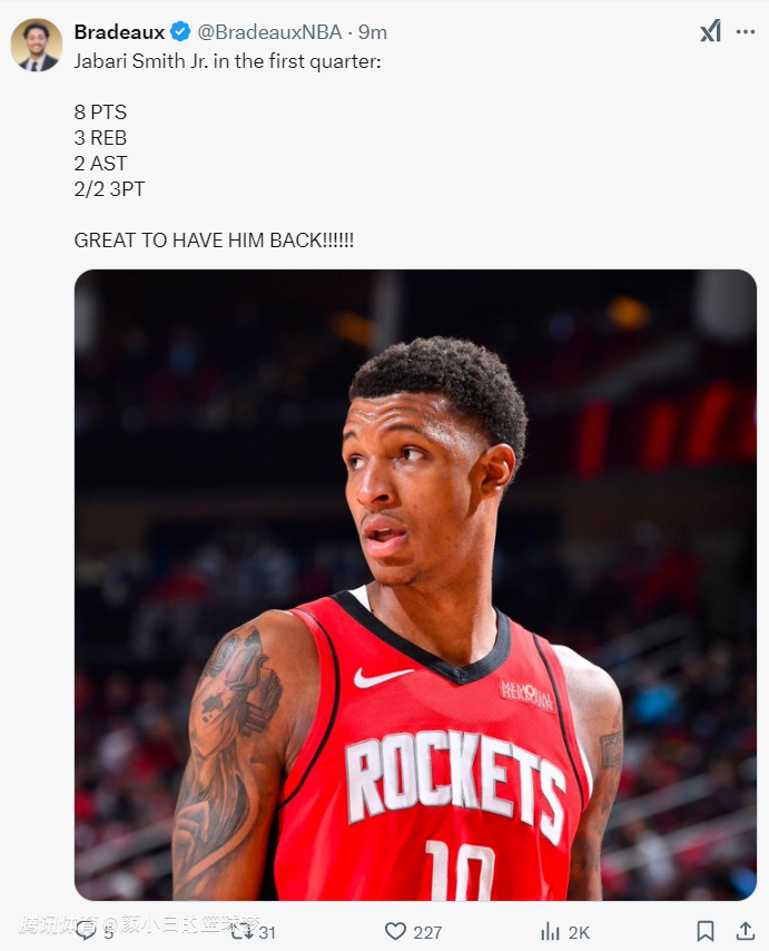 2025-02-22 14:10北京时间2月22日,火箭以121-115击败森林狼。小贾巴里-史密斯时隔51天终于迎来复出,但乌度卡 没有让他打先发似乎是有些不信任他的竞技状态能立马恢复,但小贾开场的表现就征服了乌度卡,小贾没有登场时间限制打了38分钟拿到15+9。