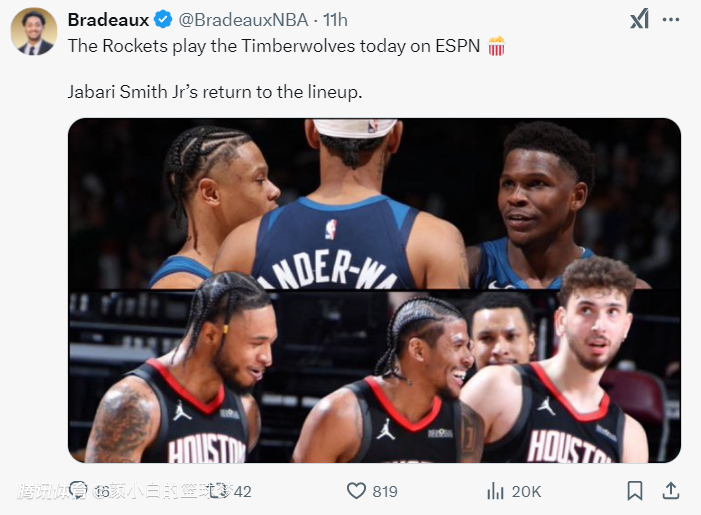 这场比赛之前休媒就预热小贾巴里-史密斯会复出,自1月2日左手骨折后已经休息了51天之久,ESPN也将直播这场火箭VS森林狼的大战。乌度卡并没有让小贾打先发,伊森还是先发四号位。