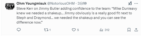 科尔在赛后称赞了吉米-巴特勒的出色表现,他说道:“邓利维知道我们需要调整,巴特勒显然非常适合在库里和格林身边……我们需要调整,你现在可以看到区别了。”