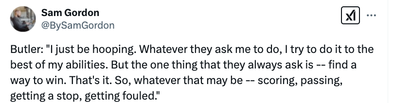 另外巴特勒也谈道:“我就是打球,无论他们要求我做什么,我都会尽我所能去做。但他们总是要求我做的一件事就是想办法赢球,就是这样,无论是得分、传球、阻止对手进攻还是造犯规(我都可以)。”