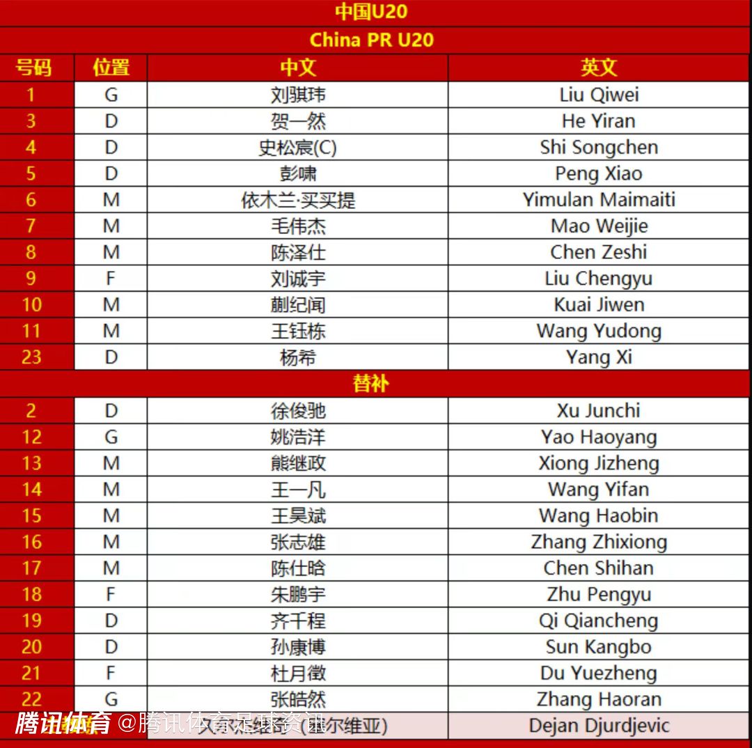 中国U20首发:1-刘骐玮、3-贺一然、4-史松宸、5-彭啸、23-杨希、6-依木兰-买买提、7-毛伟杰、8-陈泽仕、10-蒯纪闻、11-王钰栋、9-刘诚宇