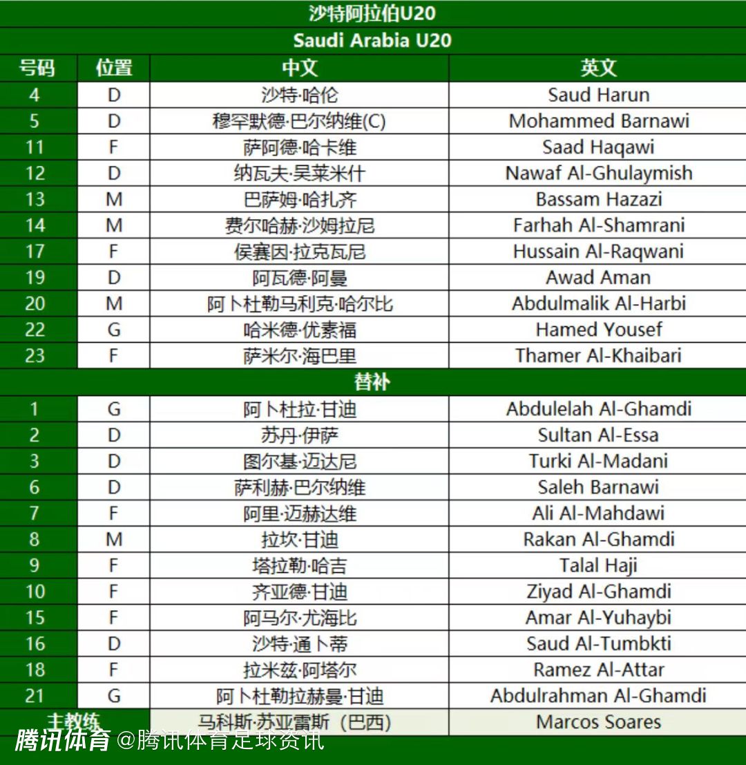 沙特U20首发:22-哈米德-优素福、4-沙特-哈伦、5-穆罕默德-巴尔纳维、12-纳瓦夫-吴莱米什、19-阿瓦德-阿曼、13-巴萨姆-哈扎齐、14-费尔哈赫-沙姆拉尼、20-阿卜杜勒马利克-哈尔比、11-萨阿德-哈卡维、17-侯赛因-拉克瓦尼、23-萨米尔-海巴里