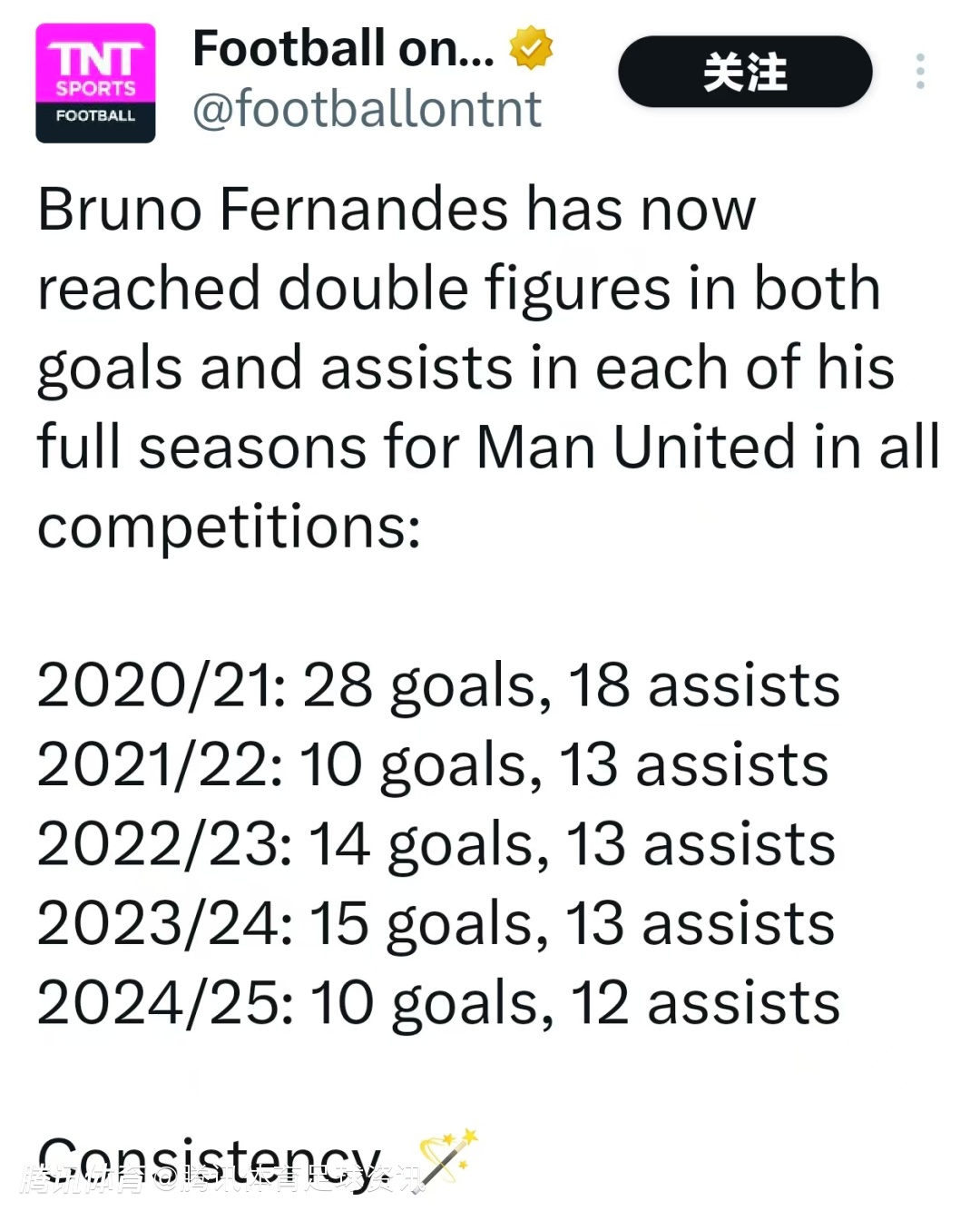 赛后,根据数据统计显示,凭借此粒进球,B费已经连续五个赛季在曼联实现进球和助攻均上双的壮举。截至目前,他本赛季代表曼联出战38次,打进10球并送出12次助攻。