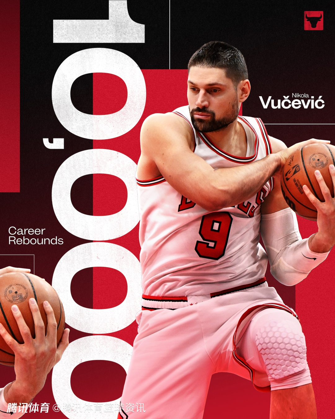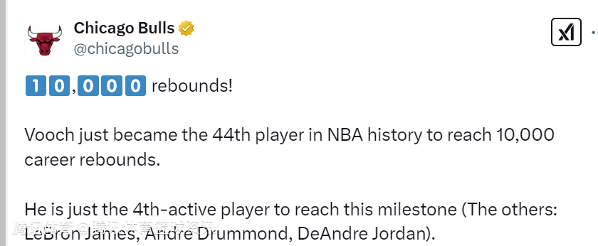 公牛官方第一时间晒出海报,祝贺武切维奇解锁生涯新里程碑。公牛官方配文写道:“10000个篮板!武切成为了NBA历史上第44位抢到10000个篮板的球员。他也是现役第4位解锁这个里程碑的球员,其他三位是詹姆斯、德拉蒙德和小乔丹。”