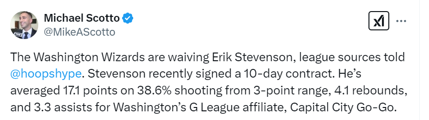 被奇才裁掉的史蒂文森,在G联赛场均17.1分4.1篮板3.3助攻,三分命中率38.6%。和奇才签下10天短合同后,他并没有得到任何出场机会。