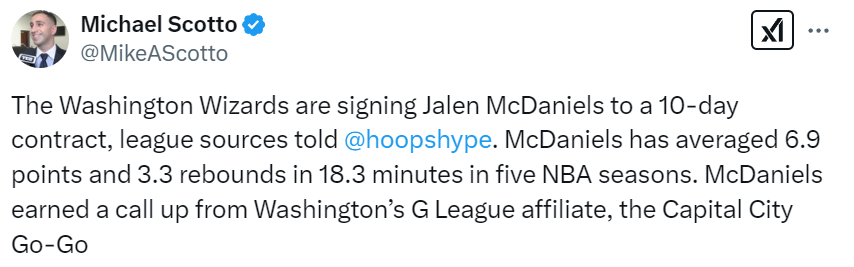 奇才一签一裁:10天短合同签下麦克丹尼尔斯 放弃G联赛三分射手