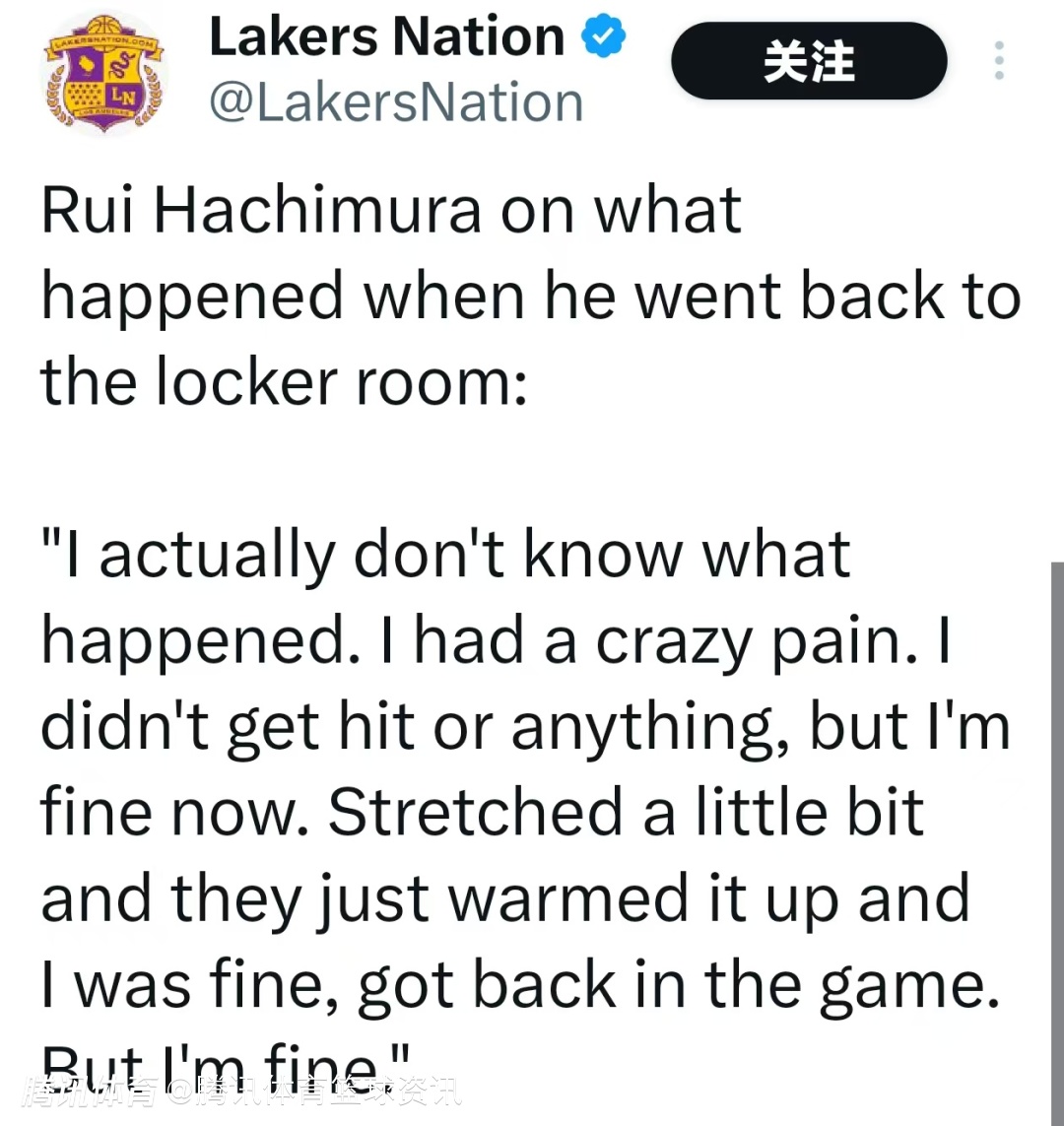 八村垒谈到他在比赛中回到更衣室的插曲:“我其实也不清楚到底发生了什么。我突然感到一阵剧痛,但并没有被撞到或者受伤。不过我现在已经没事了。我稍微拉伸了一下,他们帮我热敷了一下,之后我就恢复了,重新回到了比赛中。我现在很好。”比赛末节刚开始不久,戈登在一次篮下背身单打八村垒成功,八村垒随后准备发底线球,不过当时他捂着自己的腰部,似乎是遭遇到拉伤情况,随后八村垒下场返回更衣室治疗,不久后他重新回到球场。