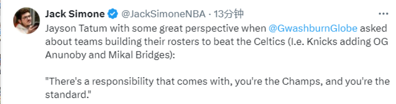 塔图姆说道:“当你成为冠军时,你会背负一种责任——你成为了其他球队的目标。这是赢得冠军后必然要面对的事情。当年勇士队处于巅峰时,其他球队都在努力构建阵容以与他们竞争。当掘金队夺冠后,森林狼队也调整了阵容,试图击败掘金。”