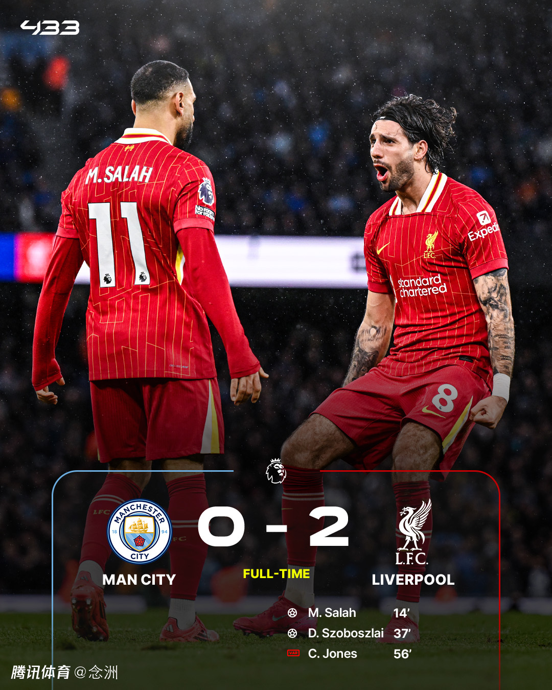 英超第26轮,利物浦客场2-0击败曼城,赛季双杀,11分领跑。刘易斯失误送角球致丢球,萨拉赫和索博斯洛伊互献传射,马尔穆什进球越位,琼斯破门越位在先。