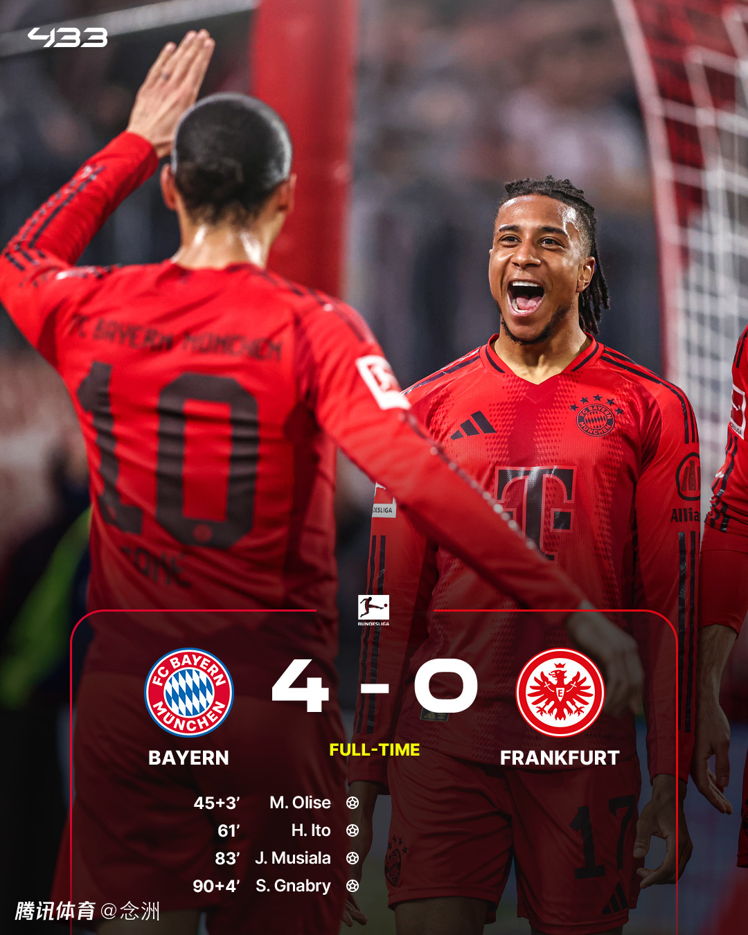 德甲第23轮,拜仁主场4-0大胜法兰克福,8分领跑。奥利塞破门,伊藤洋辉打进拜仁生涯首球,穆西亚拉一条龙,格纳布里锦上添花。