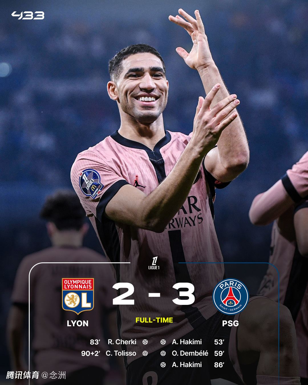 法甲第23轮,巴黎圣日耳曼客场3-2击败里昂,豪取8连胜。阿什拉夫梅开二度,登贝莱破门打入个人联赛第17球,切尔基和托利索为里昂扳回两球。