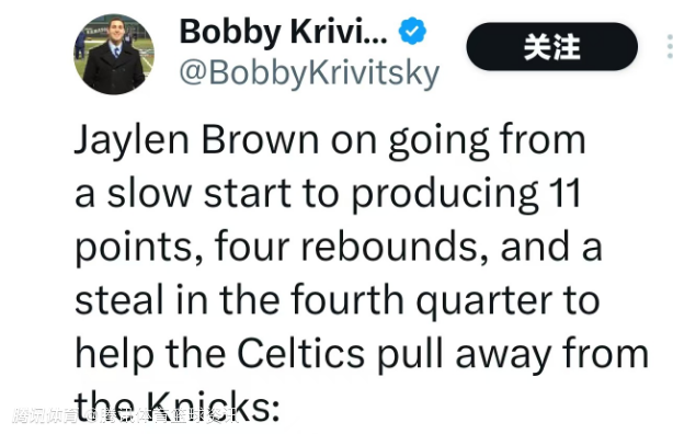 布朗谈到自己在比赛开局慢热后,如何在第四节贡献11分4篮板1抢断,帮助凯尔特人拉开与尼克斯的分差时说道:“比赛开始时状态不佳。这是早场球,身体还没完全热起来。我今天感觉不太好,最近事情很多,精力有些分散。但到了下半场,我逐渐找回了状态。这只是在比赛过程中不断调整。这种情况很正常。”