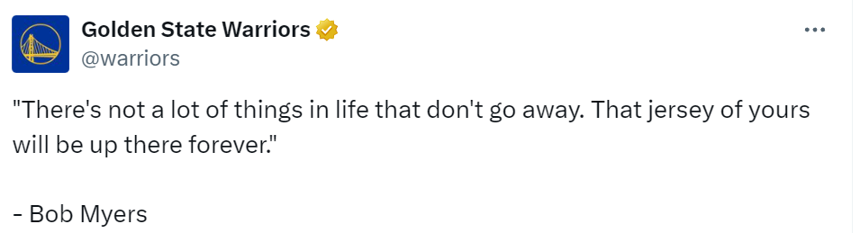 前勇士总经理鲍勃-迈尔斯是球衣退役仪式上第一位发言者,他首先感谢伊戈达拉为他和勇士队所做的一切,然后提醒伊戈达拉,勇士队最初其实是想要德怀特-霍华德,之后才转而追求伊戈达拉。他说道:“我一生中唯一一次留胡子是在我不得不筹钱去买伊戈达拉的时候。”