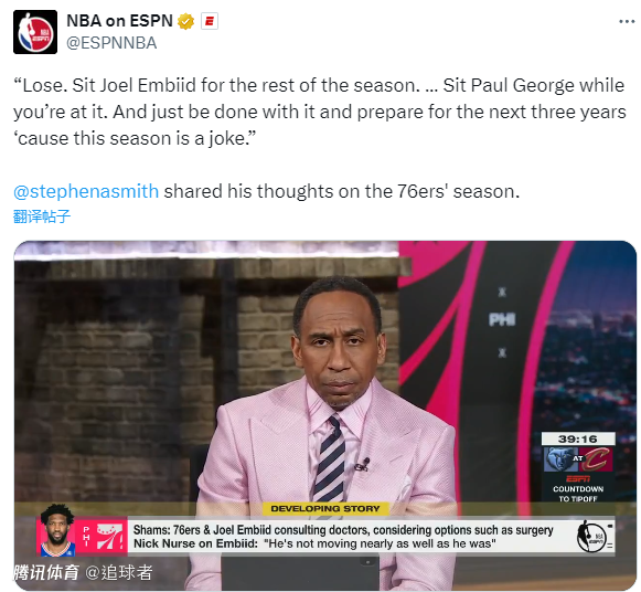 对于76人队的情况,名嘴A-史密斯表示:76人的赛季已经输了。在本赛季剩下的比赛中,让恩比德和乔治都别打了,为接下来的三年做准备八,因为这个赛季他们就是个笑话。