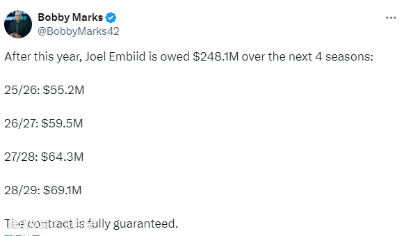 NBA薪资专家Bobby Marks表示,恩比德和76人的合同还剩四年2.481亿美元——25-26赛季5520万美元,26-27赛季5950万美元,27-28赛季6430万美元和28-29赛季 6910万美元,且合同全额保障。