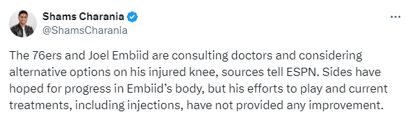 shams在节目中透露恩比德受伤细节——我被告知恩比德计划在本周早些时候对膝盖进行影像学检查,届时双方将与专家合作,确定最佳治疗路径。恩比德已经尝试了多种治疗方案,但膝盖状况一直没有好转,其中包括常规且频繁的注射,但都没有取得任何显著改善。