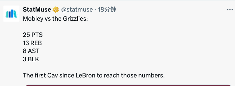 另外莫布利也在本场比赛发挥优异,在首发36分钟的上场时间里,20投10中,拿到25分13篮板8助攻3盖帽,他也成为了骑士队史自詹姆斯之后,首位打出该数据的球员。