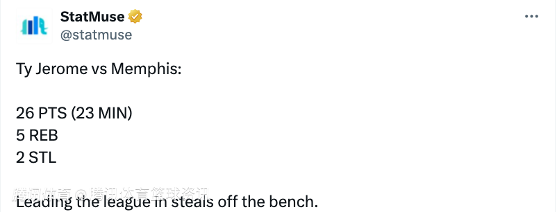 除了这两位首发,替补端的泰-杰罗姆同样表现出色,在替补22分钟的上场时间里,16投9中,三分球7中3拿到26分5篮板4助攻2抢断。据统计,本赛季杰罗姆的场均抢断领跑全联盟替补球员。