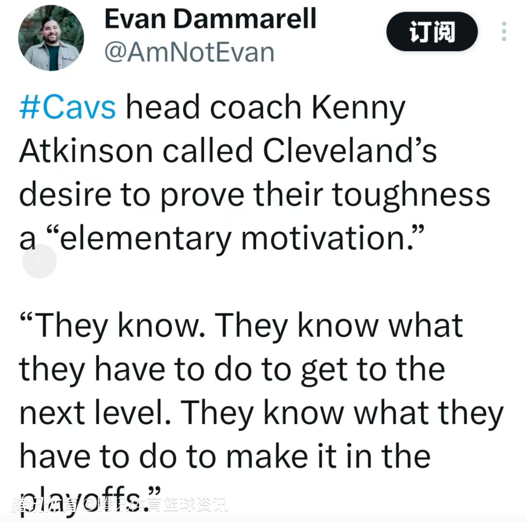 此外,阿特金森还提到球队渴望证明自己的强硬是一种本能。他说道:“队员们很清楚。他们知道自己需要做什么才能达到下一个层次,也知道自己需要做什么才能打进季后赛。”