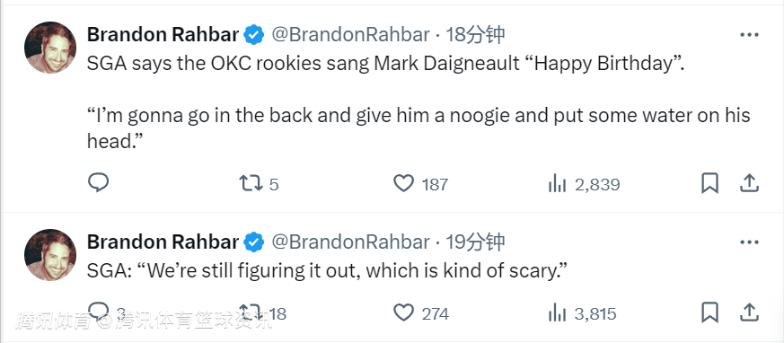 亚历山大还表示,雷霆的新秀们为主帅戴格诺特唱了生日快乐歌表达祝福:“我打算去后面给他来个‘头部按摩’,再往他头上浇点水。”