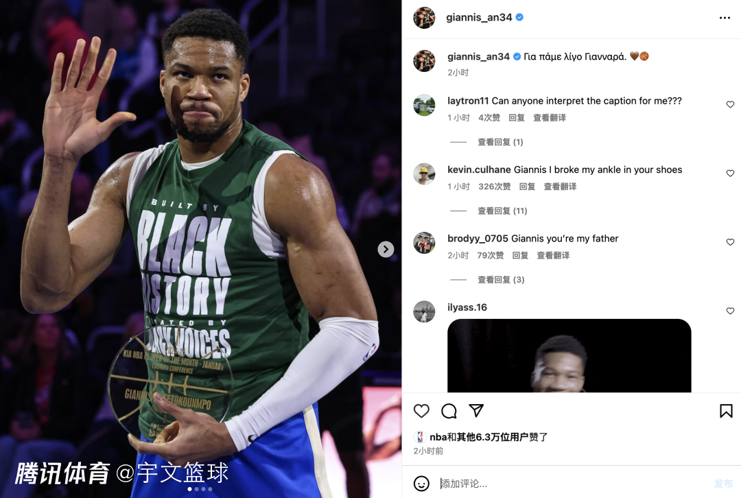 字母哥晒出自己的东部月最佳球员奖杯,并且庆祝球队赛季三杀热火