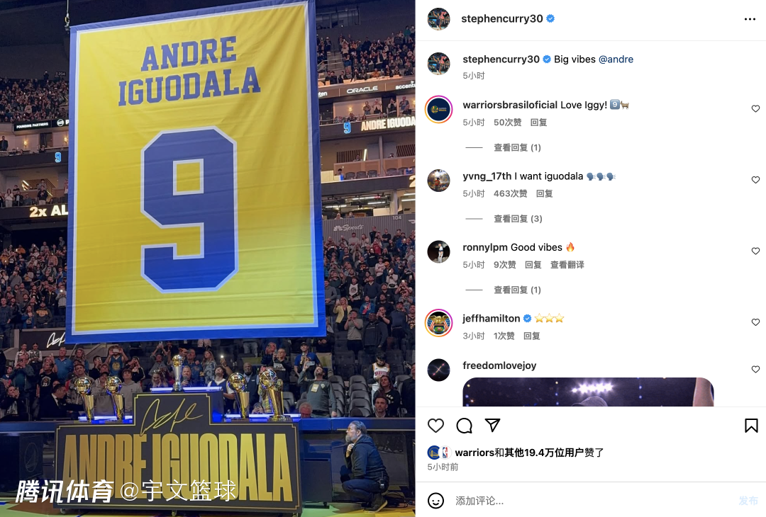 NBA社交圈:伊戈达拉勇士9号球衣退役 巴特勒湾区首秀连发27条消息