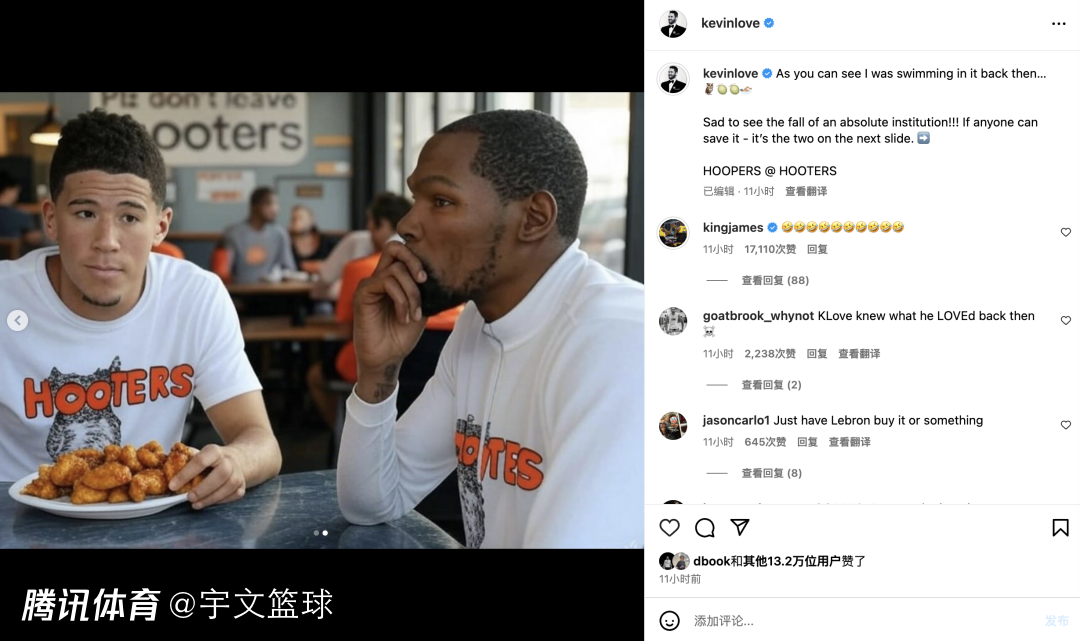全美以性感服务员著称的餐厅hooters倒闭,乐福发文感叹自己还没进入联盟前就对hooters倍感喜爱,表达他有多么不舍。同时乐福呼吁能不能找人收购它,让它重新开张,还特意晒出布克和杜兰特在hooters用餐的照片,喊话两人进行收购。詹姆斯在评论区回复哭笑不得表情,布克给乐福点赞