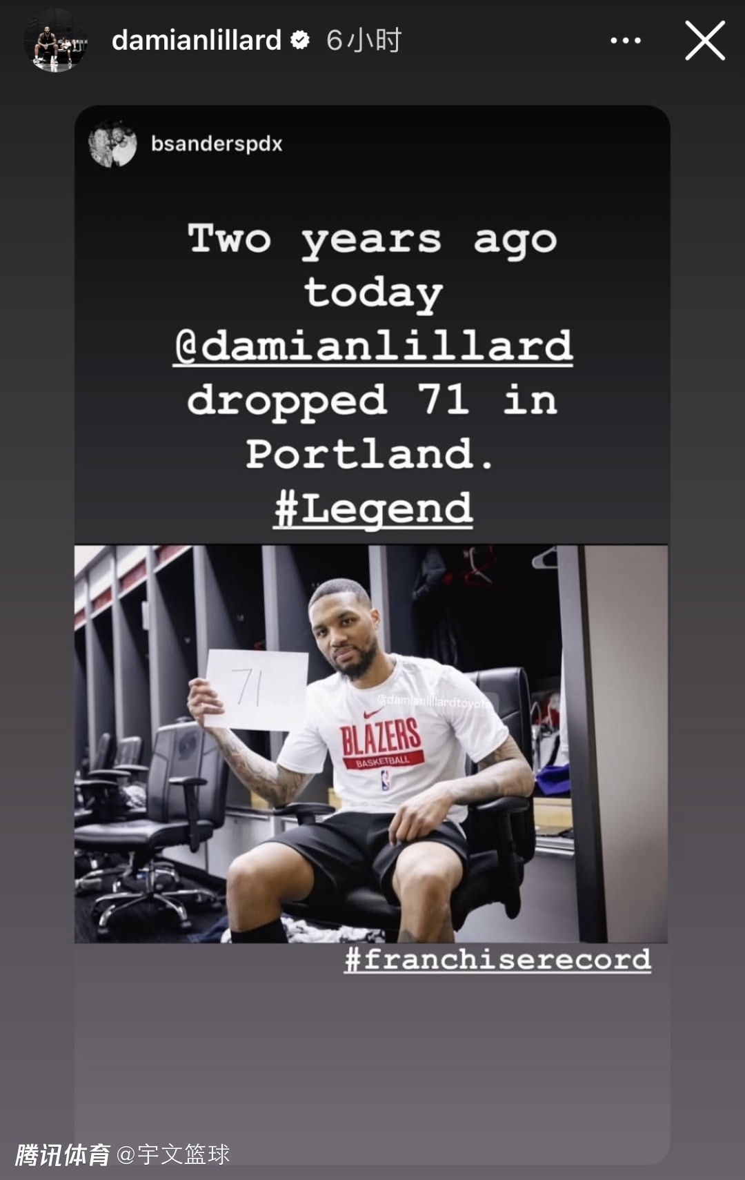 利拉德转发自己单场71分两周年的动态消息,一眨眼就两年过去了,彼时他还在效力于开拓者!