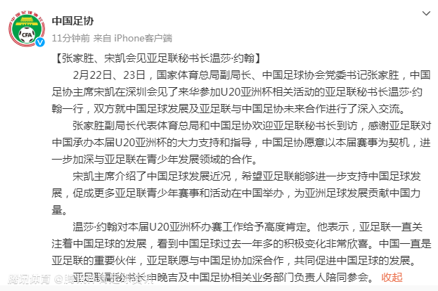 据悉,2月22日、23日,国家体育总局副局长、中国足球协会党委书记张家胜,中国足协主席宋凯在深圳会见了来华参加U20亚洲杯相关活动的亚足联秘书长温莎-约翰一行,双方就中国足球发展及亚足联与中国足协未来合作进行了深入交流。