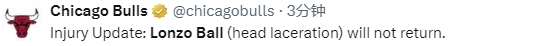 公牛官方:鲍尔头部受伤 本场比赛不会回归