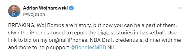 Woj在个人推特上写道:“Woj爆料已成为历史,但现在您可以成为其中的一部分。拥有我用来报道篮球界最大新闻的手机,参加NBA 选秀的证件、与我共进晚餐等也是可以竞拍的,此举是为了帮助支持圣博纳旺蒂尔大学男子篮球队。”