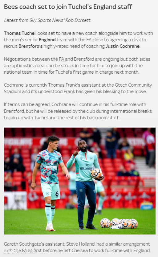 如果双方最终达成一致,科克伦仍然在布伦特福德担任全职工作,在国际比赛日期间,俱乐部将放行让他去辅佐图赫尔。对于科克伦,图赫尔和英足总技术总监麦克德莫特都认为,他能辅佐好图赫尔,而且科克伦在热刺担任青训教练时,麦克德莫特曾是他的上司,此外,科克伦 还担任过曼联青训教练,还执教过英格兰U16和U17青年队。