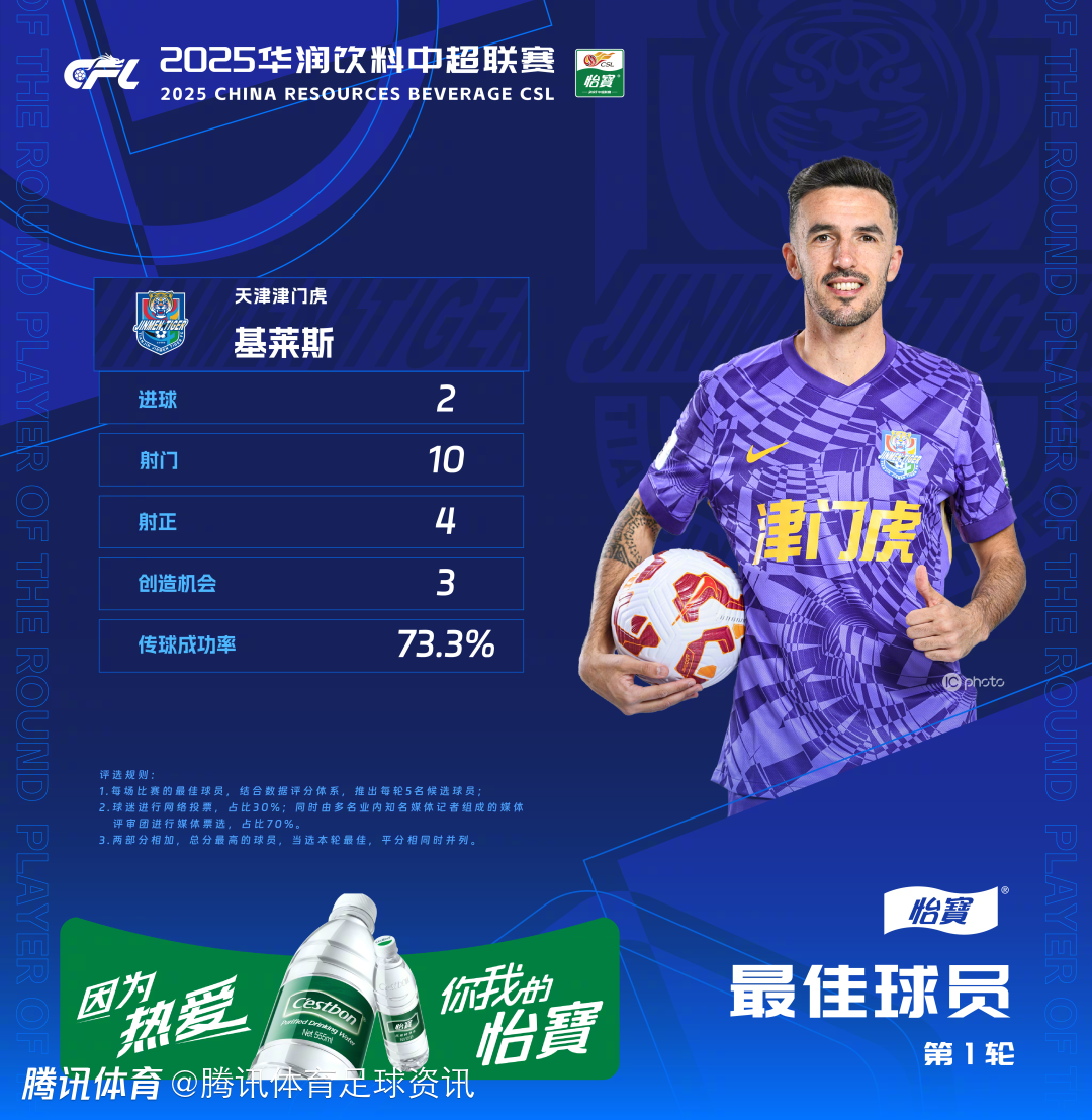 2025-02-25 20:50北京时间2月25日,中超联赛官方公布中超第1轮最佳球员评选结果,来自天津津门虎的前锋基莱斯凭借独中两元的表现当选。