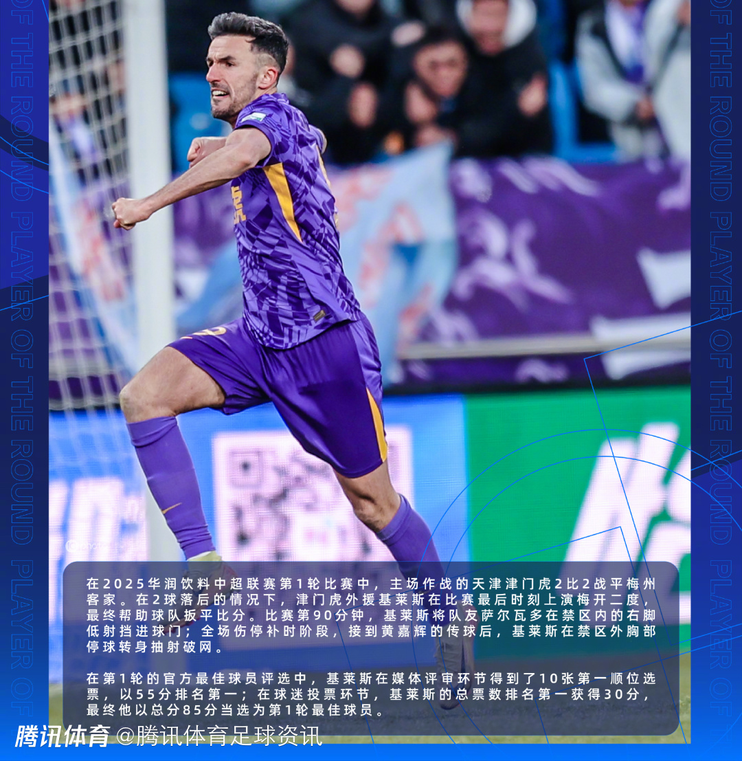 在2025华润饮料中超联赛第1轮比赛中,主场作战的天津津门虎2比2战平梅州客家。在2球落后的情况下,@天津津门虎FC 外援基莱斯在比赛最后时刻上演梅开二度,最终帮助球队扳平比分。比赛第90分钟,基莱斯将队友萨尔瓦多在禁区内的右脚低射挡进球门;全场伤停补时阶段,接到黄嘉辉的传球后,基莱斯在禁区外胸部停球转身抽射破网。