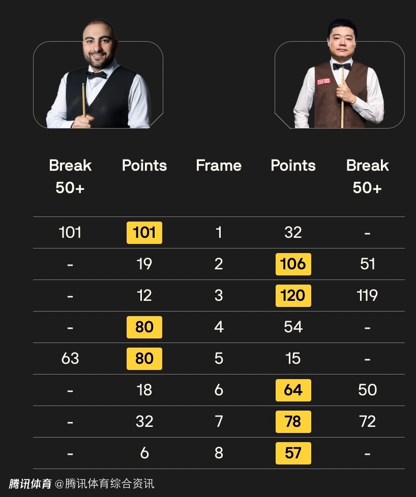 第一局,丁俊晖率先上手,但瓦菲迅速进入状态,抓住丁俊晖的失误,第一杆就打出101分的破百,拿下首局。第二局,丁俊晖找回状态,打出一杆51分,以50+扳回一局。第三局,他更是打出119分清台破百,以120-12再赢一局,从而以2-1反超比分。瓦菲不甘示弱,连下两局。丁俊晖随后打出单杆50分和72分,赢下第6局和第7局,率先拿到赛点。在最后一局中,丁俊晖多次上手,最终锁定胜局,以5-3的总比分战胜瓦菲,晋级下一轮。