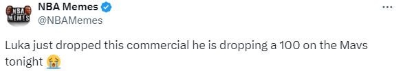 究竟东契奇首战旧主能拿到多少分?美媒NBA Memes调侃东契奇刚刚发布了更换车牌的广告,他今晚能够拿到100分;帕森斯表示湖人会让东契奇接管比赛,詹姆斯会给东契奇喂球,他得分会超过31.5分且能带队获胜。