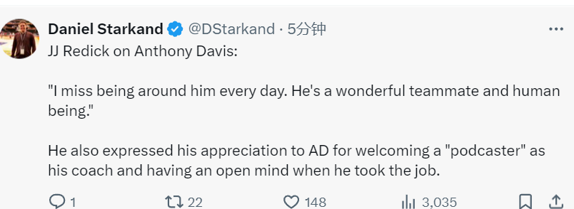 在谈到浓眉时,雷迪克说道:“我想念每天和他在一起的时光,他是一个很棒的队友和人。我很感激他,因为他曾欢迎一名播客主持人成为他的教练,而且对于我接受这份工作持开放态度。”