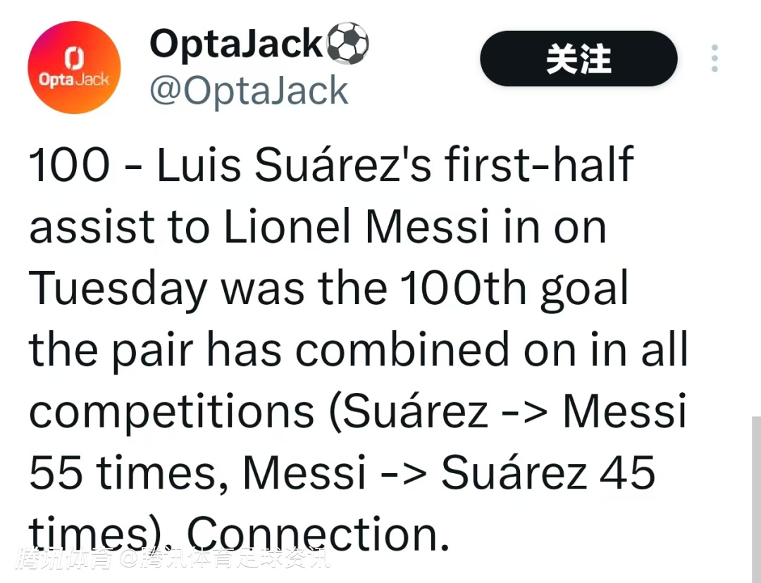 据Opta发布的数据统计显示,苏亚雷斯在上半场为梅西送出的助攻是他们二人在各项赛事中第100次相互助攻进球。其中,苏亚雷斯为梅西助攻55次,而梅西为苏亚雷斯助攻45次。