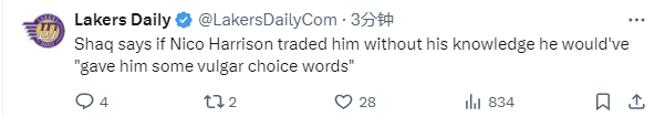 2025-02-26 11:10北京时间2月26日,NBA常规赛继续进行,独行侠队对阵湖人队。解说本场比赛的前NBA球员“大鲨鱼”奥尼尔谈到了独行侠总经理哈里森,并直言如果他在不知情的情况下被哈里森交易,那么自己会对哈里森喷一些脏话。