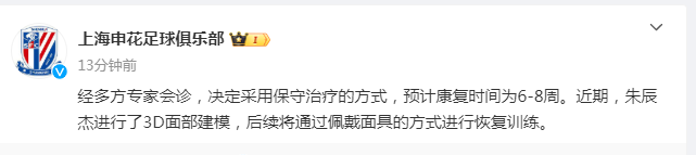 今天上海申花更新了朱辰杰的伤情公告,公告中写道:“经多方专家会诊,决定采用保守治疗的方式,预计康复时间为6-8周。近期,朱辰杰进行了3D面部建模,后续将通过佩戴面具的方式进行恢复训练。”
