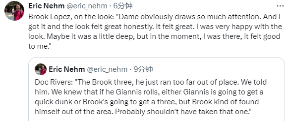 里弗斯谈到了大洛佩兹最后时刻的三分出手,当时雄鹿队95-98落后3分,大洛佩兹三分不中。里弗斯表示:“他跑得太远了,我们事先的布置是打挡拆,要么字母哥顺下扣篮,要么大洛佩兹拉到外线投三分,但大洛佩兹接球的位置离三分线太远了,也许他不应该投那个球。”