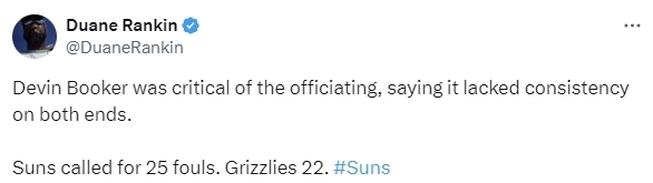 2025-02-26 13:30北京时间2月26日,NBA常规赛继续进行,太阳队经过加时苦战,最终148-151不敌灰熊队。太阳队球员德文-布克此役出战35分钟,20投12中得到28分3篮板10助攻,在比赛中吃到6犯被迫退场。而在比赛结束后,布克接受采访时抨击裁判,表示本场比赛的吹罚尺度不公平。