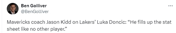 在谈到东契奇时,基德表示:“他填满数据栏的能力是其他球员无法比拟的。”值得一提的是,在赛前接受媒体采访时,基德曾表示,虽然交易的发生令人震惊,但大家如今只能朝前看希望东契奇能继续带着微笑打球,并相信东契奇在湖人队依然会是全世界最佳的篮球运动员之一。