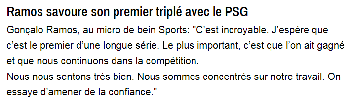 谈及自己在巴黎圣日耳曼的第一个帽子戏法,他说道:“这简直难以置信。我希望这只是众多帽子戏法中的第一个。当然,最重要的还是赢得比赛。我们会继续保持这样的势头。至于一周后对阵利物浦的比赛?我们会专注于训练和比赛本身。我们会在这一周里努力提升信心,但在此之前,我们还有一场比赛要踢。”