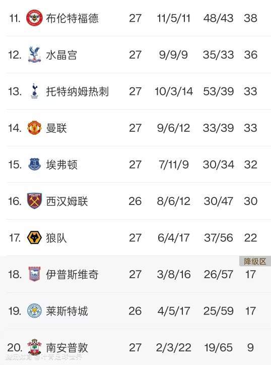 积分榜上,曼联27场33分,排名从第15升至第14位,积分与热刺相同,但-6个净胜球不敌热刺(14个净胜球)。