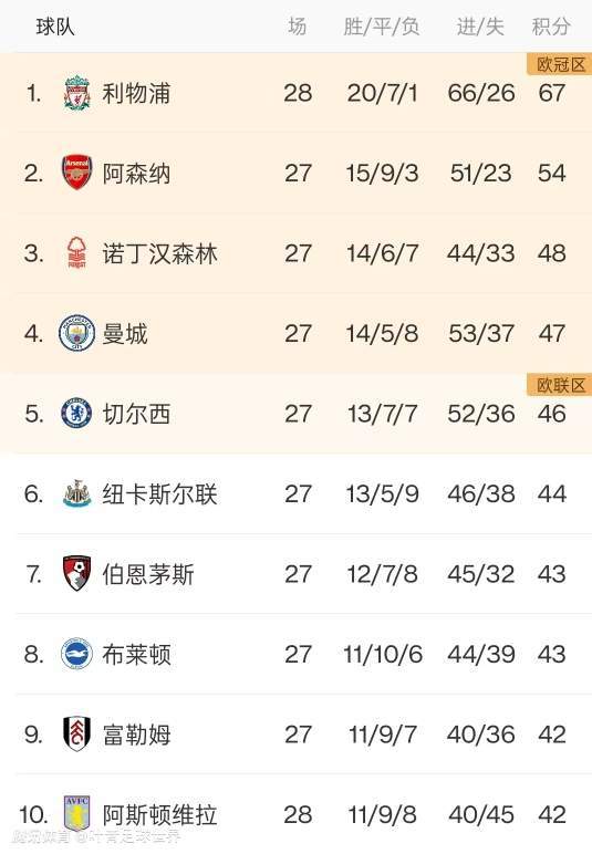 诺丁汉森林27场48分、曼城27场47分、切尔西27场46分、纽卡斯尔27场44分、伯恩茅斯27场43分、布莱顿27场43分、富勒姆27场42分、维拉28场42分,8支球队争夺第3和第4,仅有6分的差距!